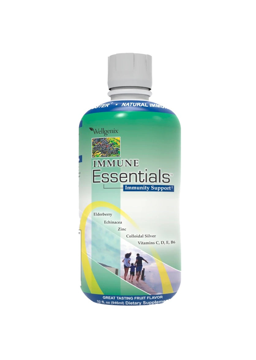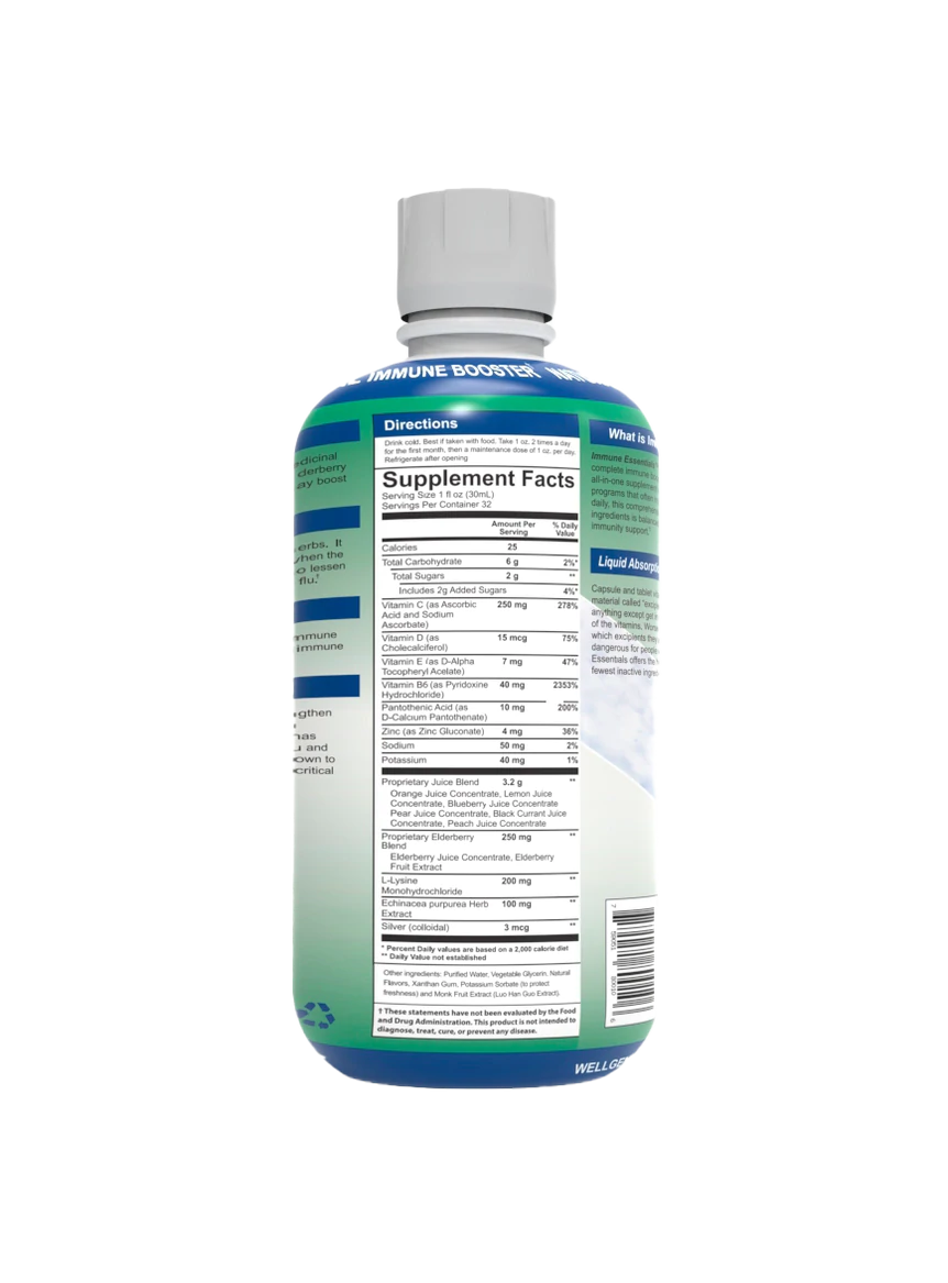 Immune Essentials™ is the most innovative and complete immune boosting supplement. This complete all-in-one supplement replaces outdated programs that often include taking up to 10 pills daily. In 1 ounce daily, this comprehensive combination of all natural ingredients provides optimum immunity support with Elderberry, Echinacea, Zinc, Vitamin D, C, E, B6 and Colloidal Silver. Immune Essentials uses only the highest quality ingredients to provide your body with 24-hour total Immunity Support! Great for individuals who cannot swallow tablets or capsules. One month supply